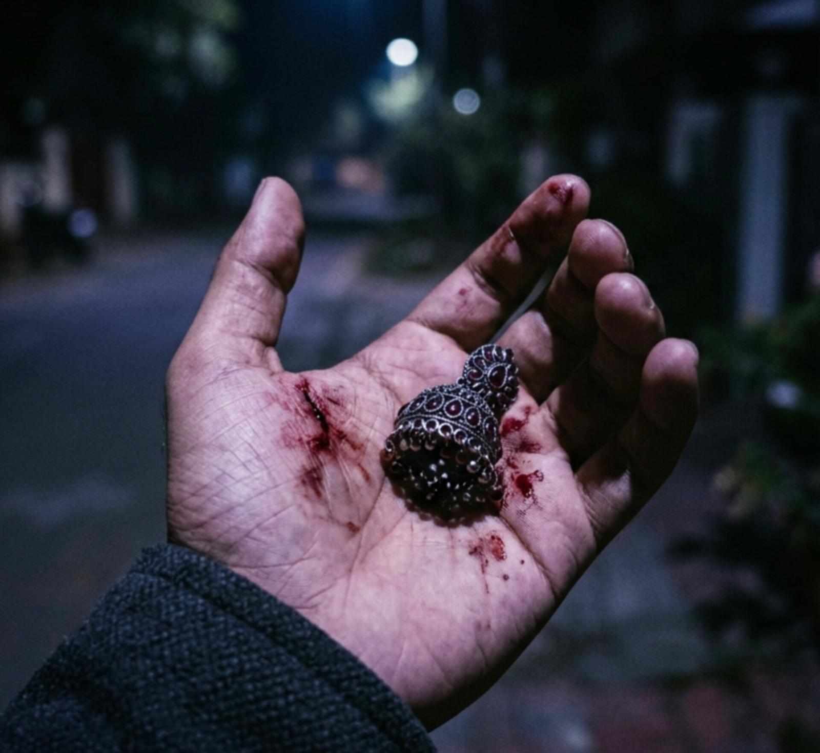 He stood there, intensely staring at the blood-stained jhumka resting in his wounded hand.